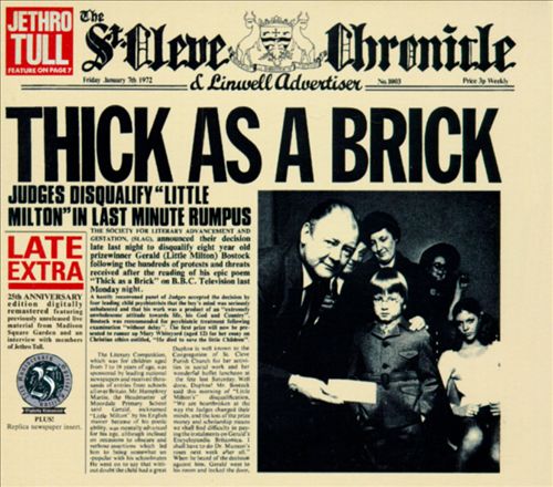 Lançado em 1972, Thick As a Brick foi o quinto álbum lançado pelos britânicos do Jethro Tull. Foi também o primeiro álbum que contemplou a verdadeira essência do rock progressivo. Dividida em duas partes, a única faixa do disco conta uma história que dá espaço para a criatividade para diferentes instrumentos da banda. As harmonias oitavadas com guitarra e órgão, a mudança de tempo e, é claro, a inconfundível flauta transversal tocada divinamente pelo frontman da banda, Ian Anderson, compõem uma obra prima.