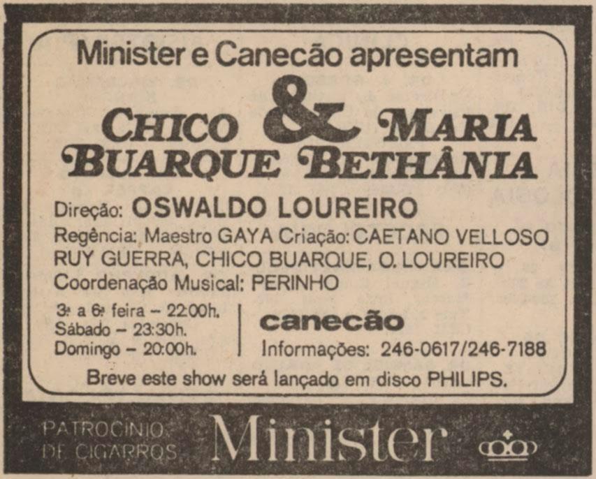 O show de Chico Buarque e Maria Bethânia se iniciava com um viés explicitamente político. A versão de “The Impossible Dream” e a primeira interpretação do samba “Sinal Fechado”, de Paulinho da Viola, feita por duas vozes explicitava a existência de um Brasil amordaçado e que sonhava com a possível liberdade no horizonte. No entanto, um dos momentos mais eletrizantes do espetáculo ocorria quando Bethânia e Chico entoavam “Sem Fantasia”, canção escrita por ele na década anterior. Os versos apontam o desejo de dois amantes de se (re)encontrarem após um sofrido tempo de separação, com direito a um dos arranjos mais belos do maestro Gaya: